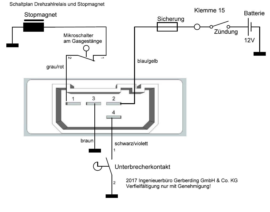Schaltungstechnisch ist das Relais mit Mikroprozessortechnik zur Erkennung der Schaltdrehzahlen (1520 UPM und 1350 UPM) und moderner Leistungselektronik zur Ansteuerung des Stopp-Magneten ausgerüstet. Die Vorteile liegen in einer exakten und temperatur-, sowie alterungsstabilen Drehzahlerkennung und einem kurzschlußfesten Ausgang für den Magneten, ohne mechanischem Verschleiß.