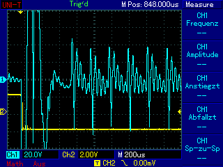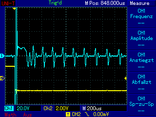 Trotzdem ist in Fehlerbeschreibungen zu eingesandten HKZ-Steuergeräten immer wieder folgender Satz zu lesen: " 12V werden nicht auf die Zündspule durchgeschaltet". Das verwundert auch nicht, da an der Zündspule nur im Zündmoment für ca. 20 Mikrosekunden ca. 400V anliegen. Mit Multimetern ist das Signal nicht meßbar. Messungen sind nur mit Oszilloskopen möglich, die über eine Zeitbasiseinstellung im 5 oder 10 Mikrosekundenbereich verfügen sollten.